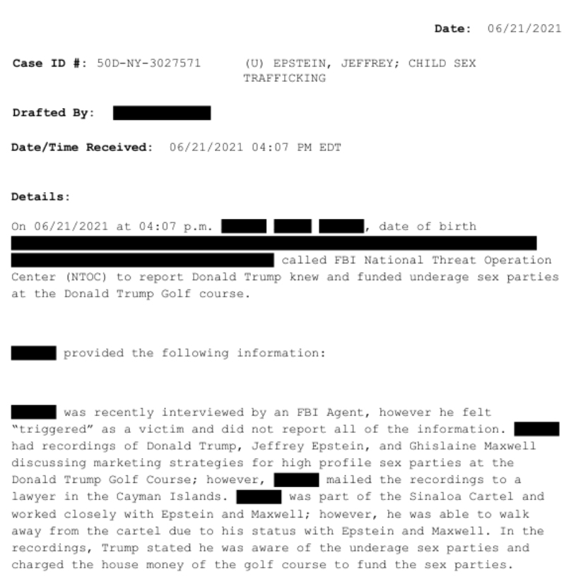 Am 21.06.2021 um 16:07 Uhr X, Geburtsdatum X, rief das FBI National Threat Operation Center (NTOC) an, um zu melden, dass Donald Trump von Sexpartys mit Minderjährigen auf dem Donald Trump Golfplatz wusste und diese finanzierte.