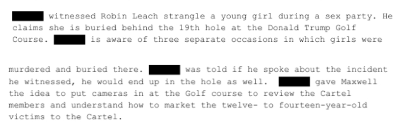 X hat gesehen, wie Robin Leach während einer Sexparty ein JUNGES Mädchen ERWÜRGT hat. Er behauptet, sie sei hinter dem 19. Loch des Donald Trump Golf Course begraben. X weiß von drei verschiedenen Fällen, in denen Mädchen ERMORDET und dort begraben wurden. X wurde gesagt, wenn er über den Vorfall, den er miterlebt hatte, sprechen würde, würde er ebenfalls in dem Loch landen. X brachte Maxwell auf die Idee, Kameras auf dem Golfplatz anzubringen, um die Kartellmitglieder zu beobachten und zu verstehen, wie man die zwölf- bis vierzehnjährigen Opfer an das Kartell VERMARKTEN könnte.