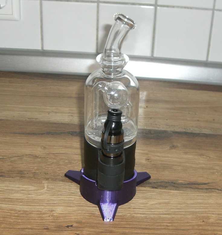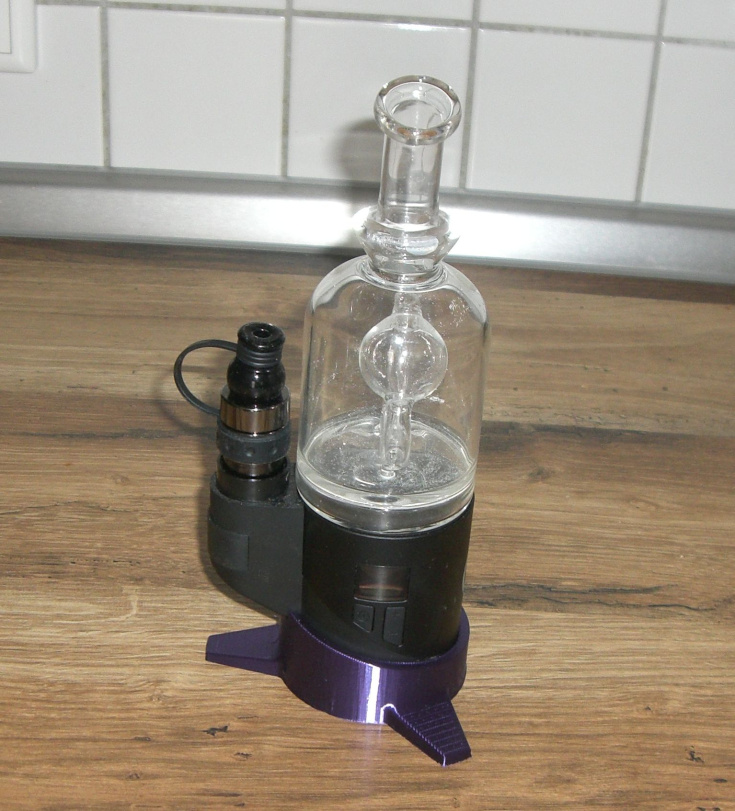 Der Standfuss gibt dem doch recht unsicher stehenden E-Rig einen sicheren Stand. Eine kleine Aussparung and er Seite sorgt dafür, dass das Stromkabel problemlos angeschlossen werden kann ohne den Fuss dafür abnehmen zu müssen.